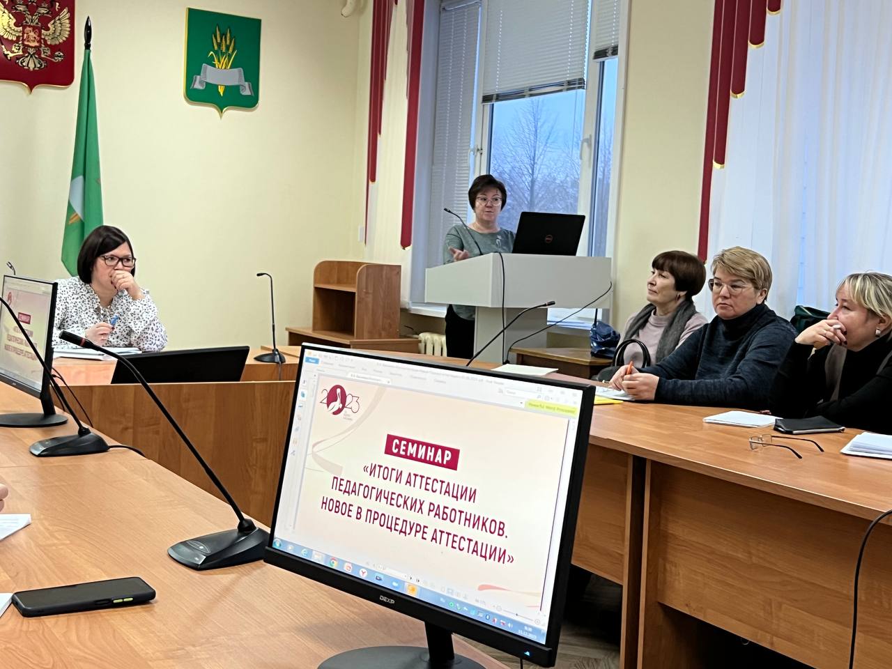 15 декабря 2023 г состоялся муниципальный семинар «Аттестация педагогических работников. Новое в процедуре аттестации». В работе семинара приняли участие руководители, заместители руководителей образовательных организаций, старшие воспитатели, специалисты (эксперты) для изучения и анализа результатов профессиональной деятельности педагогических работников. В ходе мероприятия были проанализированы результаты аттестации педагогических работников региона и округа. Заведующий информационно-методическим отделом Управления образования Житкова Н.А. рассказала об особенностях аттестации в соответствии с вновь утвержденным Порядком аттестации учителей, воспитателей дошкольных учреждений. В основе представленных слушателям сведений были материалы регионального семинара «Аттестация педагогических работников. Новое в процедуре аттестации», который прошел в Вологде 28 ноября2023 года.