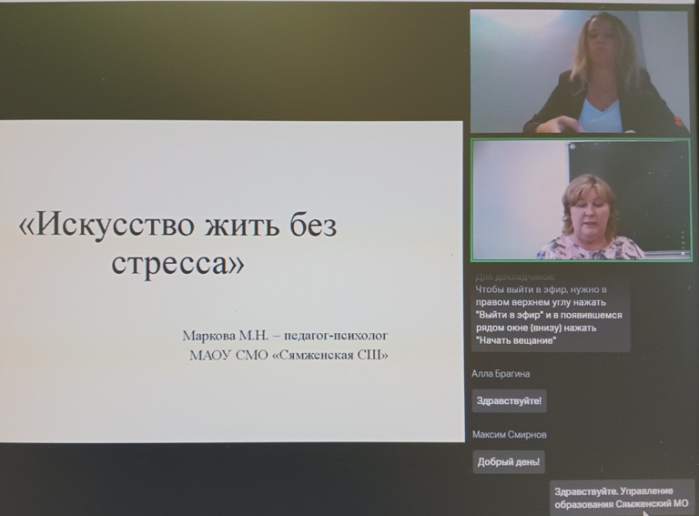 В работе практикума «Я в ресурсе» (профилактика эмоционального выгорания: трансформация негативных переживаний, поиск новых ресурсов) приняла участие Маркова Марина Николаевна, учитель начальных классов, педагог-психолог МАОУ СМО «Сямженская СШ» Тема ее выступления «Искусство жить без стресса».