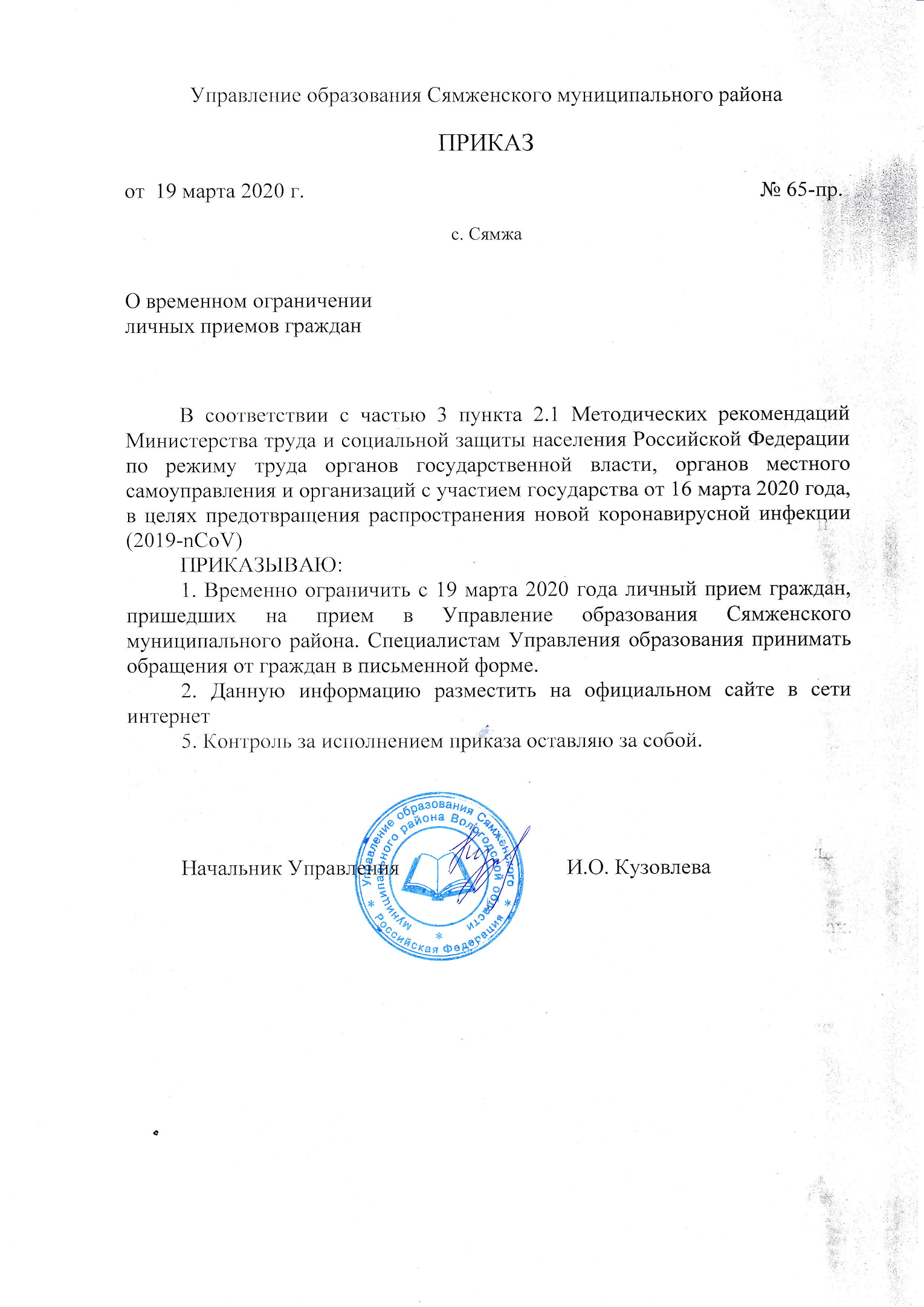 Управление образования Сямженского муниципального района сообщает, что в период нерабочей недели с 30 марта по 03 апреля 2020 года в каждом дошкольном образовательном учреждении с. Сямжа будут открыты дежурные группы по присмотру и уходу за детьми. В дежурные группы будут приниматься дети, только тех родителей (законных представителей), на которых не распространяется режим нерабочих дней, согласно Указу Президента РФ от 25 марта 2020 г. N 206 "Об объявлении в Российской Федерации нерабочих дней".