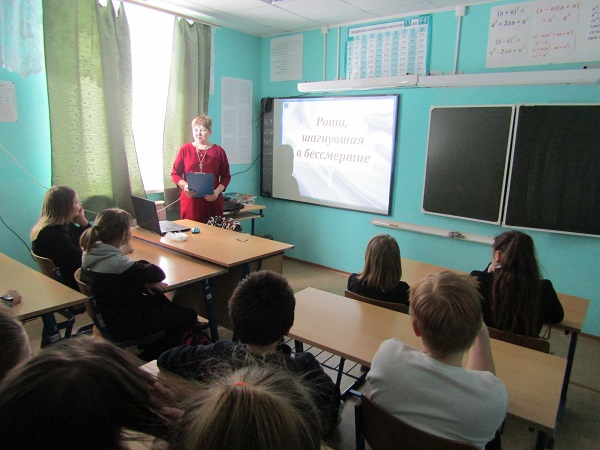 Обучающиеся Гремячинской школы посмотрели документальный фильм "Легенды армии. Шестая рота". В конце мероприятия все школьники получили плакаты и значки. Уроки мужества прошли в 9-11 классах Сямженской средней школы. О подвиге десантников школьникам было рассказано на классных часах и уроках мужества "Рота, шагнувшая в бессмертие" в Коробицынской, Режской, Двиницкой школах. В ходе мероприятий показаны видеосюжеты «Подвиг 6-й роты псковских десантников», "Высота 776", прочитаны стихотворения о мужестве и героизме бойцов 6-й роты, прозвучали песни, посвященные памяти воинов-десантников.