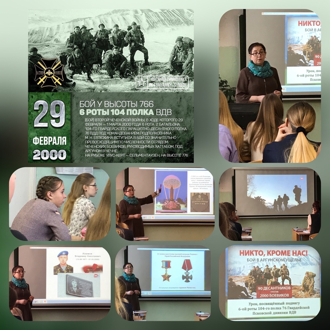 В рамках проведения памятных мероприятий, посвящённых 20-летию подвига десантников 6 парашютно-десантной роты 104 гвардейского парашютно-десантного полка 76 гвардейской воздушно-десантной дивизии в в образовательных учреждениях района проведены уроки мужества, классные часы, кинолектории.