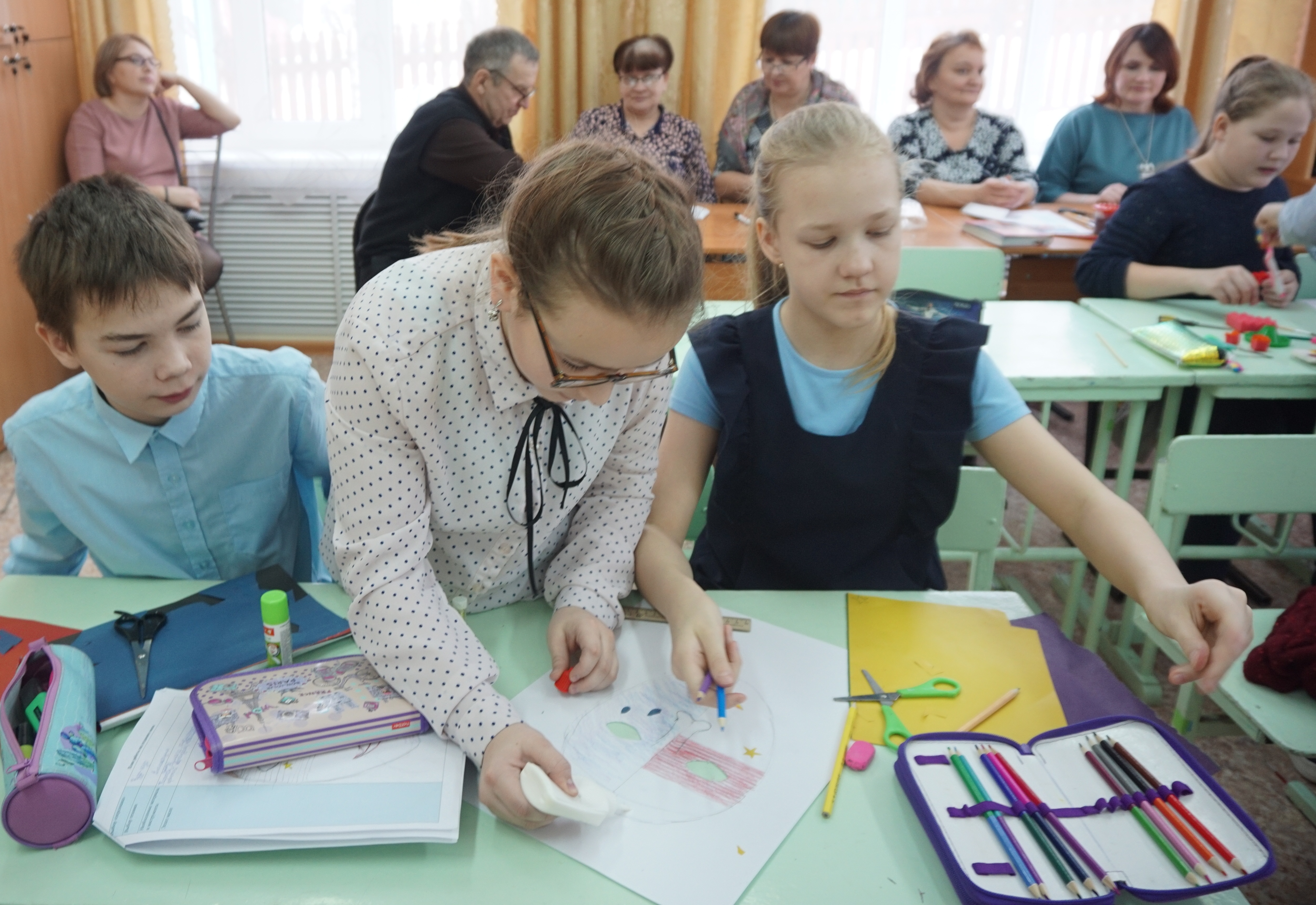 Мастер-класс по проектной деятельности в рамках урока ИЗО в 5 классе провела Муравьева И.Ю. Работа над практической частью проекта «Рождественская маска» объединяла три проектные группы учащихся. По окончании занятия группы презентовали готовые продукты проекта.