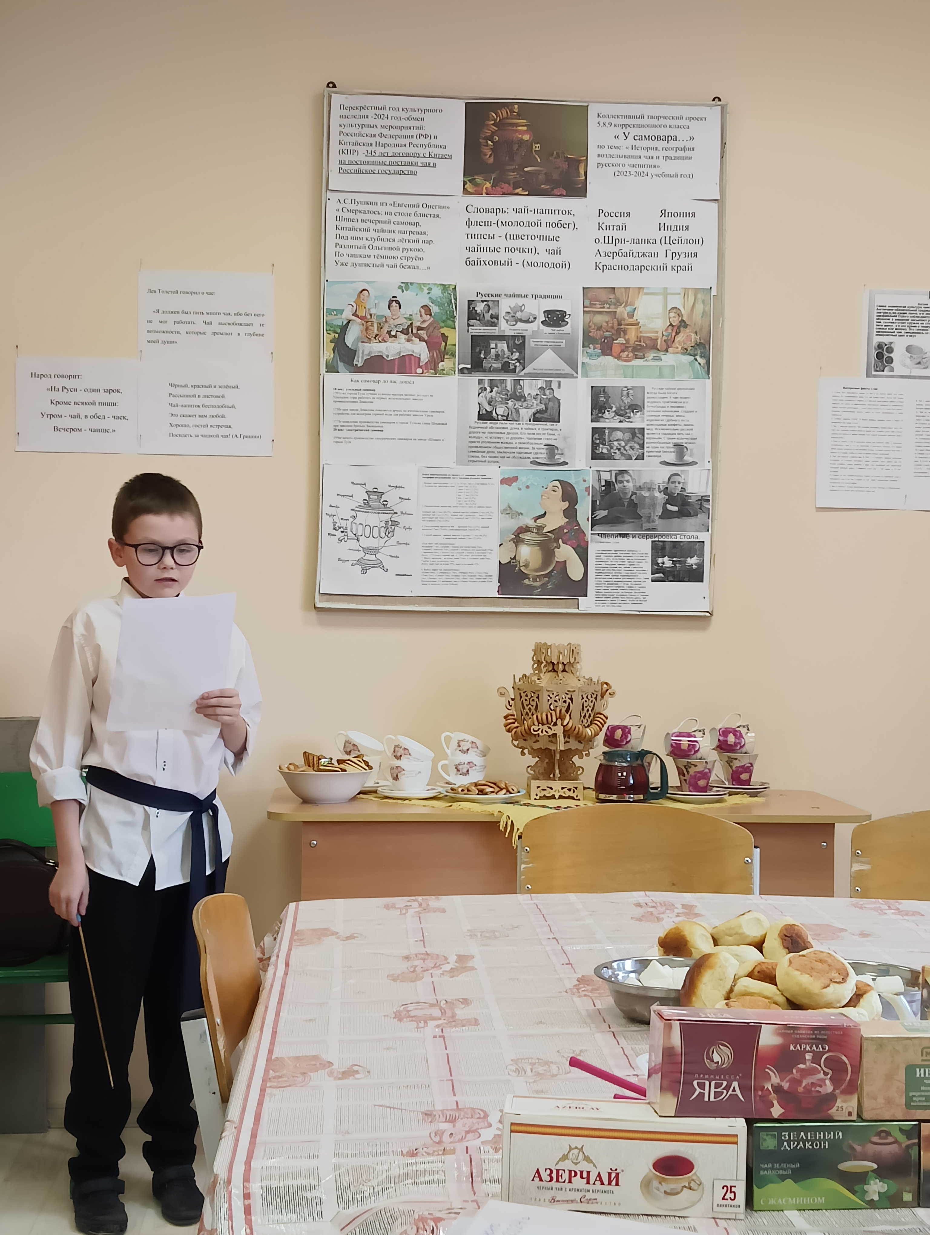 18 апреля в коррекционных классах (5-9 класс) прошло итоговое мероприятие – защита коллективного исследовательского проекта «У самовара: история, география возделывания чая и традиции русского чаепития». Тема, план, сбор материала и реализация коллективной работы были совместно разработаны классным руководителем Барановой И. В. и учащимися. Была проделана большая работа – ребята провели анкетирование по теме проекта, традициям чаепития в своих семьях, а также изучили тему по справочным данным, литературным и художественным источникам. Рассказывая о выращивания чайной культуры, учащиеся работали с географической картой. Вся информация была четко структурирована, это не вызывало у детей трудности в ее представлении. Каждый ученик оформил папку проекта. Совместно с классным руководителем учащиеся творчески подошли к презентации работы, сделали костюмы той страны, о которой рассказывали. На презентацию работы ребята пригласили педагогов и своих родителей. Надо отметить, что Ирина Валерьевна не ограничивается только подачей материала адаптированных программ, учитель уделяет большое внимание развитию общего кругозора детей с особенностями развития.
