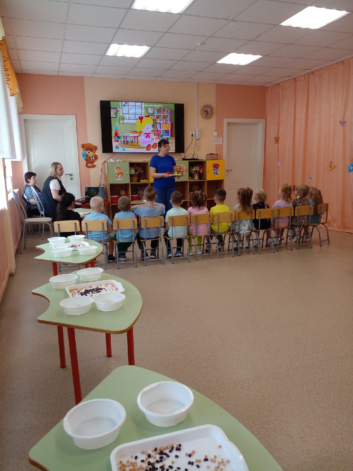 Воспитатель Костыгина Анна Андреевна показала во второй младшей группе занятие с использованием элементов методики Марии Монтессори «Мамины помощники». Хромцова Елена Ивановна, воспитатель первой младшей группы, выступила на тему «Развитие детей младшего дошкольного возраста по методике М. Монтессори». Также педагог продемонстрировала видео занятия с малышами , на котором Елена Ивановна показала игры с детьми по знакомству с русской народной игрушкой Матрешкой.