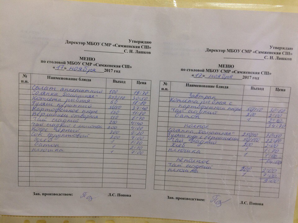 В соответствии с Планом работы РРК 17 ноября 2017 года осуществлен общественный контроль за организацией питания в Сямженской средней и начальной школах. Родители осматривали помещение столовых, наличие спецодежды у работников пищеблока, оценивали блюда на вкус и внешний вид. Порции по весу соответствуют норме, блюда вкусные, теплые, хорошо проварены, хлеб, булочка свежие. По результатам родительской проверки положительные стороны, замечания, предложения доведены до директора школы и записаны в журнал проверок.